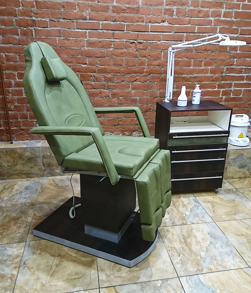 ​Педикюрное кресло оснащено двумя электромоторами, обеспечивающими регулировку высоты и угла наклона сиденья. Опоры для ног фиксируются при помощи газ-лифтов. Кресло легко раскладывается в горизонтальное положение, образуя ровную поверхность. Надежная конструкция системы подъема обеспечивает высокую устойчивость кресла даже при максимальной высоте. Управляется при помощи ручного проводного пульта. Дополнительно при производстве могут быть установлены различные опции.