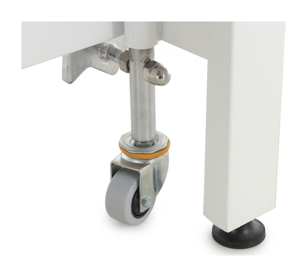 • Для удобной перекатки предусмотрены 2 пары колёс (Ø50×25 мм) с механизмом выдвижения нажимного типа, позволяющим перемещать стол усилиями одного человека.
