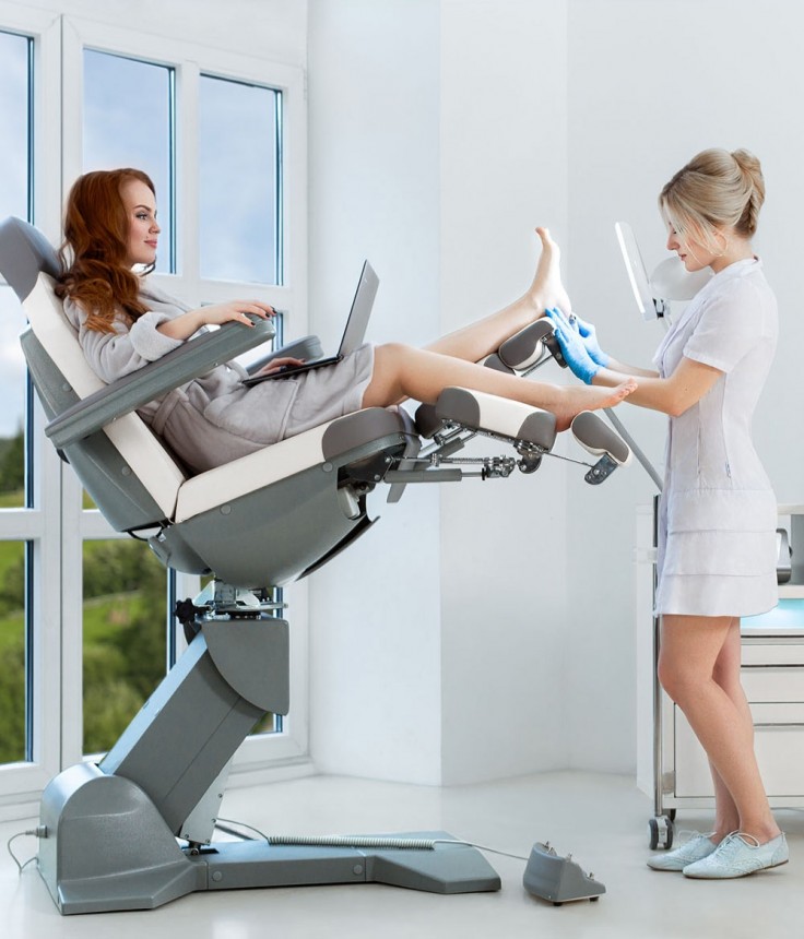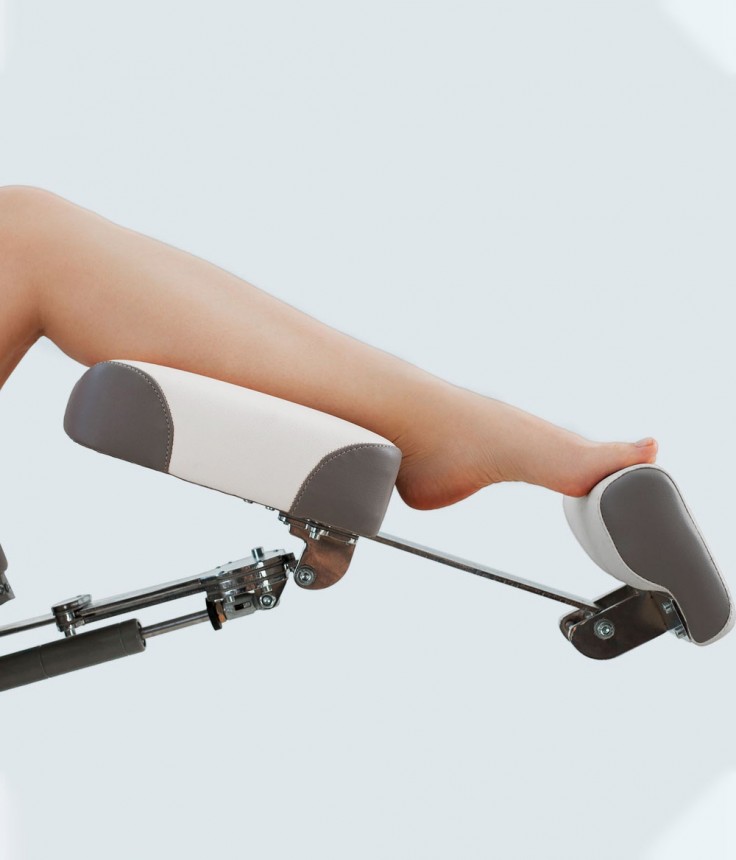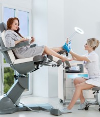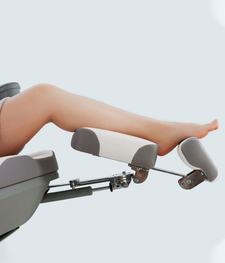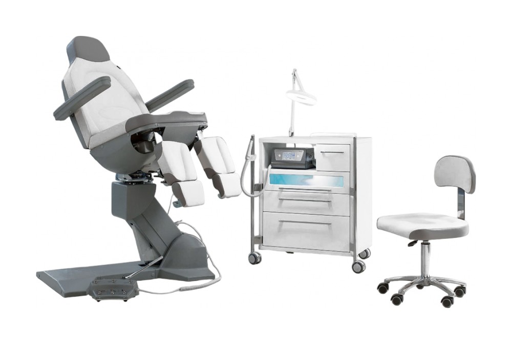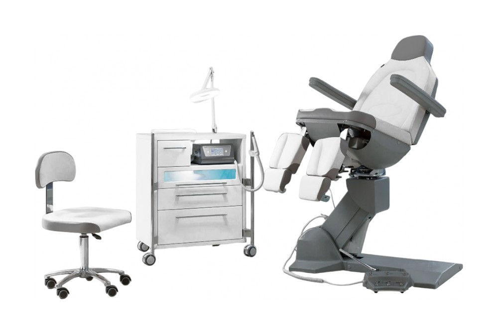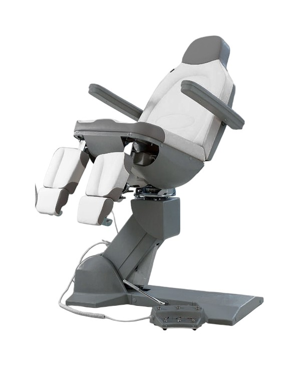 Педикюрное кресло оснащено тремя электромоторами, обеспечивающими регулировку высоты, угла наклона спинки и угла наклона сиденья. Опоры для ног фиксируются при помощи газ-лифтов. Кресло легко раскладывается в горизонтальное положение, образуя ровную поверхность. Надежная конструкция системы подъема обеспечивает высокую устойчивость кресла даже при максимальной высоте. Откидывающиеся подлокотники делают более удобным процесс посадки клиента. Управляется при помощи ручного проводного пульта.