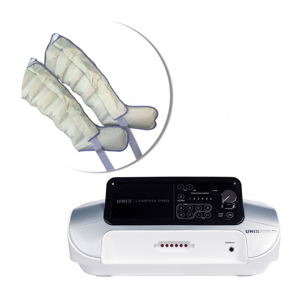 Комплект Unix Lympha Pro 2 (Юникс Лимфа Про 2) с манжетами для ног — профессиональный 6-и канальный аппарат прессотерапии. Предназначен для длительных, ежедневных нагрузок, обладает простой и понятной схемой управления и всем, наиболее востребованным, функционалом.